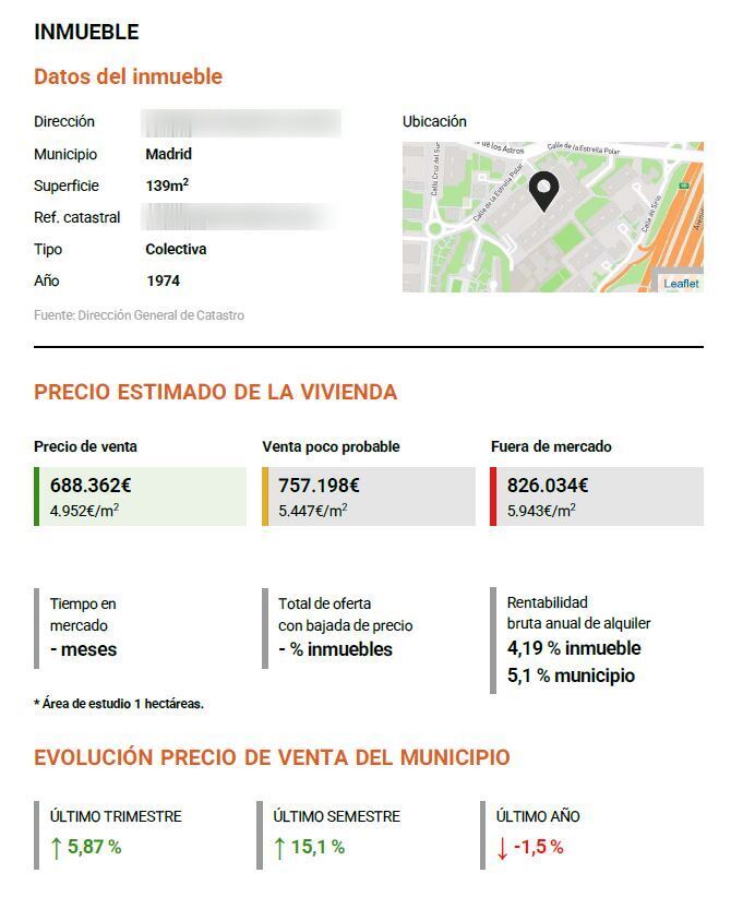 Recibirás en tu email un detallado informe con un rango de precio de mercado, la evolución del precio en tu municipio, los puntos de interés y el entorno demográfico.