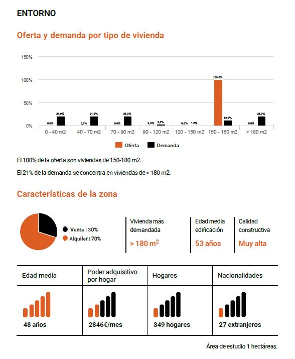Por otro, tendrás información clave sobre las viviendas de la zona: oferta y demanda según el tipo de inmueble, superficies más buscadas, antigüedad media de los edificios y calidad constructiva.